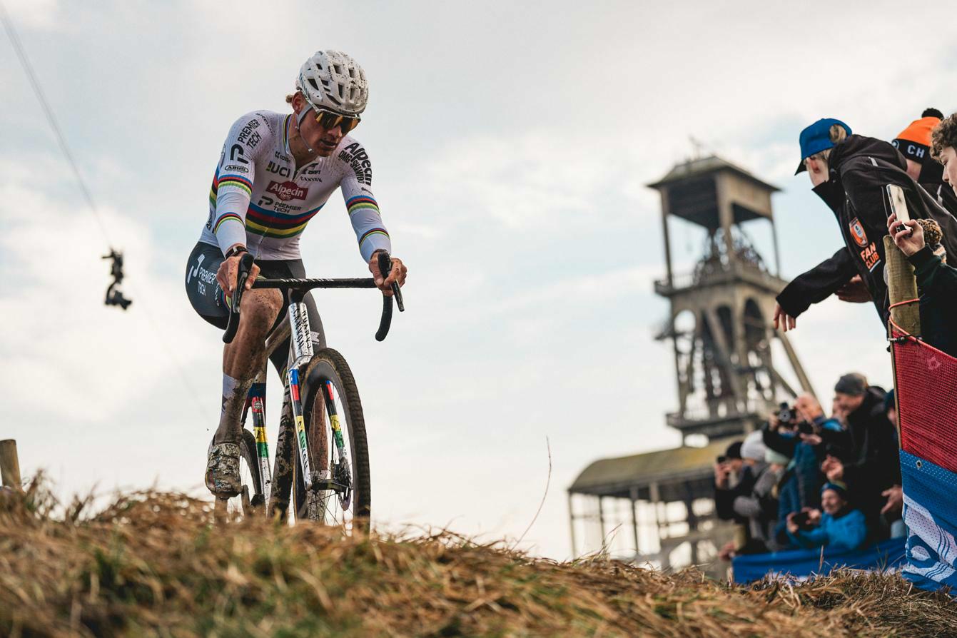 Wereldkampioen Mathieu van der Poel heeft er een pittige werkdag op zitten in Maasmechelen. Ondanks twee lekke banden wist de Nederlander z’n 50ste zege in de Wereldbeker te pakken. Hij haalde het voor z’n ploegmaats Del Grosso en Vandeputte.